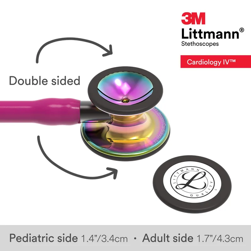 The 3M Littmann Cardiology IV Stethoscope is a diagnostic acoustic instrument designed for healthcare professionals requiring superior sound clarity and versatility. This model features a dual-lumen chestpiece constructed from stainless steel, with tunable diaphragms on both the adult and pediatric sides. The acoustic seal created by the earpieces, combined with the chestpiece design, facilitates the isolation of subtle auditory cues.