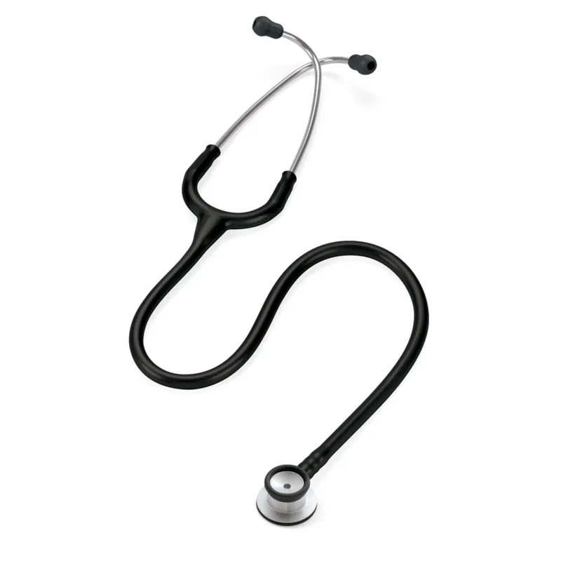 Regular cleaning of the stethoscope according to manufacturer guidelines is recommended to maintain hygiene and performance. The black tubing is designed for durability and ease of cleaning. This stethoscope is a single-unit device and does not require assembly.