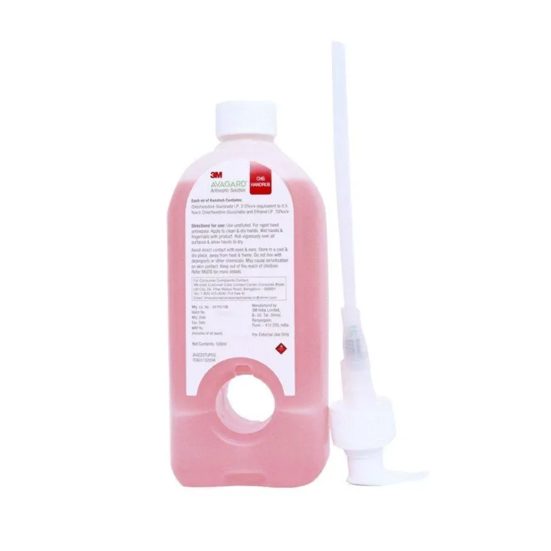 This product is an antiseptic hand rub formulated with Chlorhexidine Gluconate and Ethyl Alcohol, designed for effective hand hygiene. It is presented in a 500 ml container, intended for external use to reduce transient microorganisms on the skin of the hands. The formulation aims to provide a broad spectrum of antimicrobial activity.