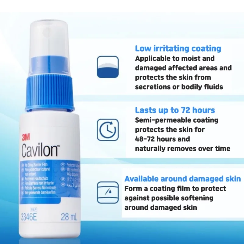 It is also hypoallergenic, indicating it is designed to minimize the risk of allergic reactions. The product dries quickly to form a transparent, breathable film that adheres to the skin. This film is designed to remain in place for an extended period, offering protection for up to 72 hours.