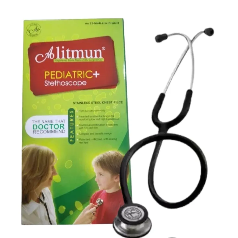 The Alitmun Pediatric Stethoscope is a diagnostic instrument designed for auscultation in pediatric patients. It is engineered to facilitate the clear and accurate transmission of internal body sounds, such as cardiac and pulmonary activity, in infants and young children. The device features a specifically sized chest piece and a sensitive diaphragm, optimized for the anatomical characteristics of younger individuals.