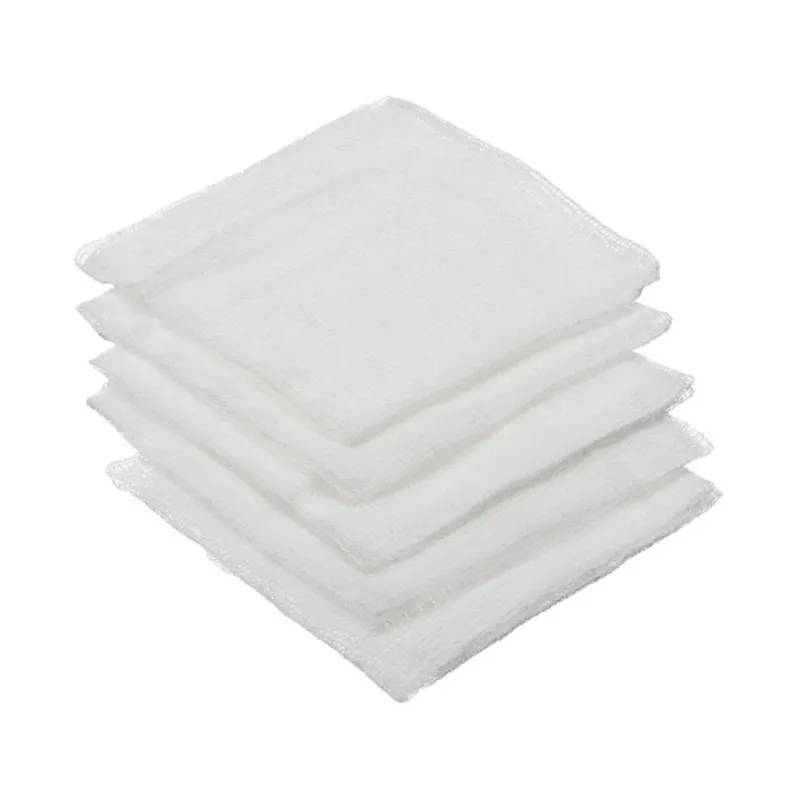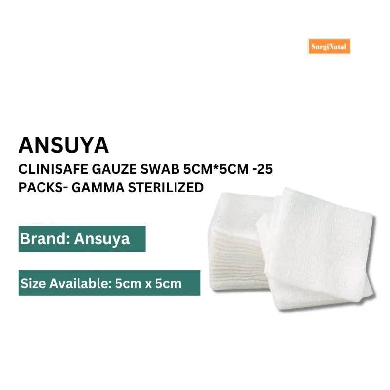 This product consists of sterile gauze swabs designed for medical and wound care applications. Each swab measures 5cm by 5cm and is manufactured from fine yarn, which contributes to its absorbency and suitability for contact with skin. The material is processed using hydrogen peroxide for bleaching, resulting in a white, clean appearance.