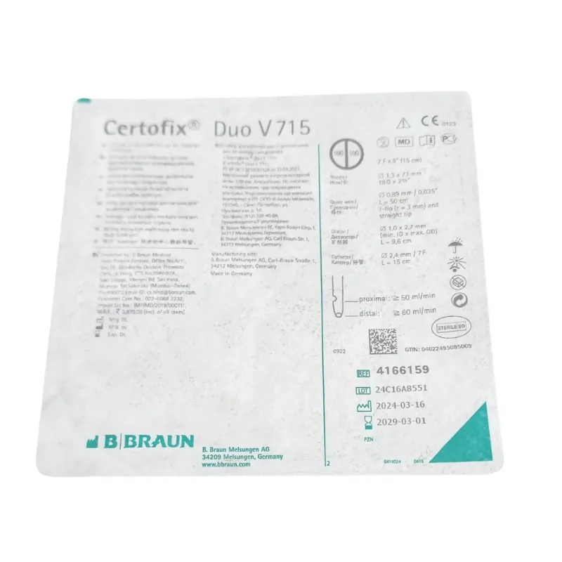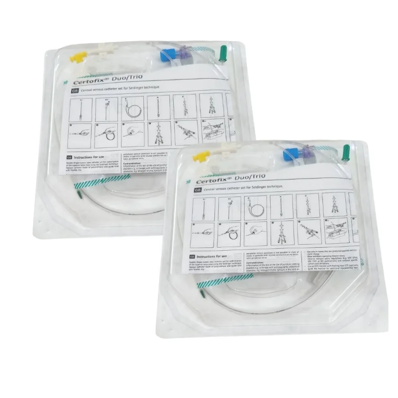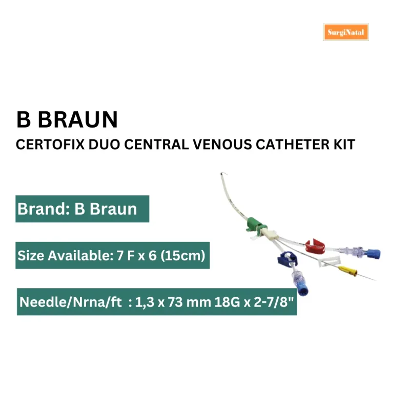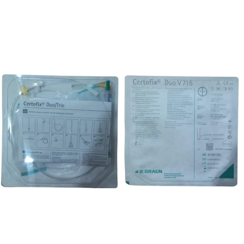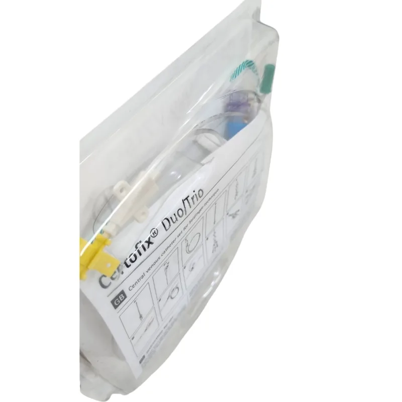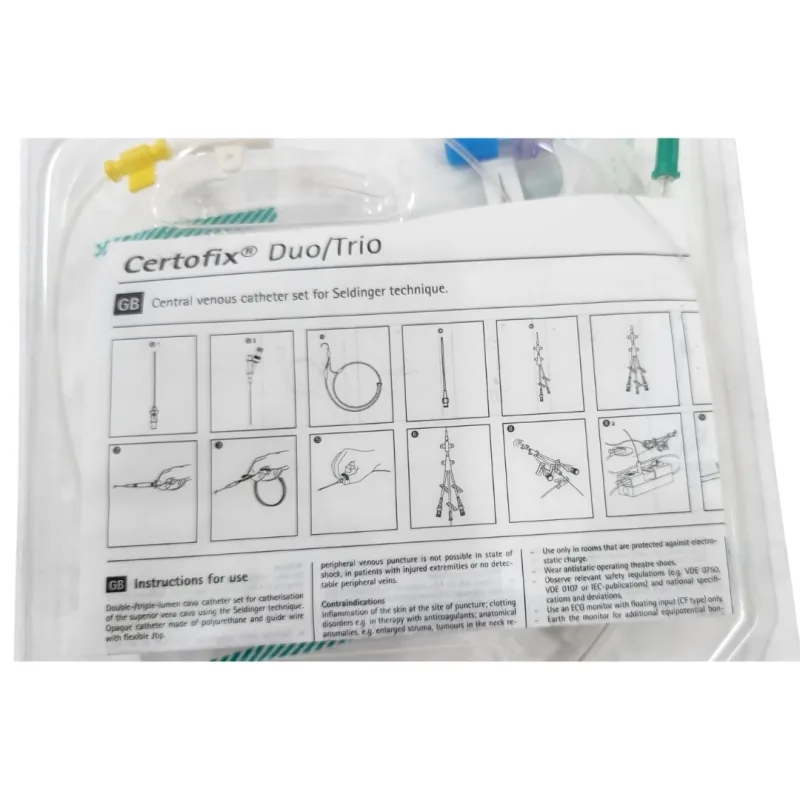 The Certofix Duo Central Venous Catheter Kit is a medical device designed for establishing central venous access. This kit facilitates the insertion of a double-lumen catheter into a central vein, such as the vena cava, utilizing the Seldinger technique. The dual lumen design allows for concurrent administration of fluids or medications and the withdrawal of blood samples, enhancing procedural efficiency.