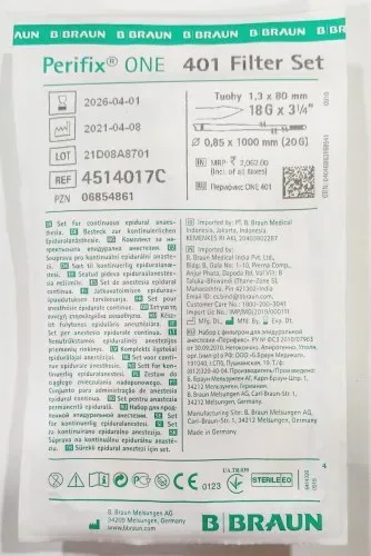 The Perifix One 401 Filter Set is a sterile medical device designed for the filtration of fluids intended for administration. Its primary function is to remove particulate matter, microorganisms, and air from these fluids, thereby enhancing their safety and purity during medical procedures. The set is engineered to integrate seamlessly into existing fluid pathways, ensuring a reliable filtration process.