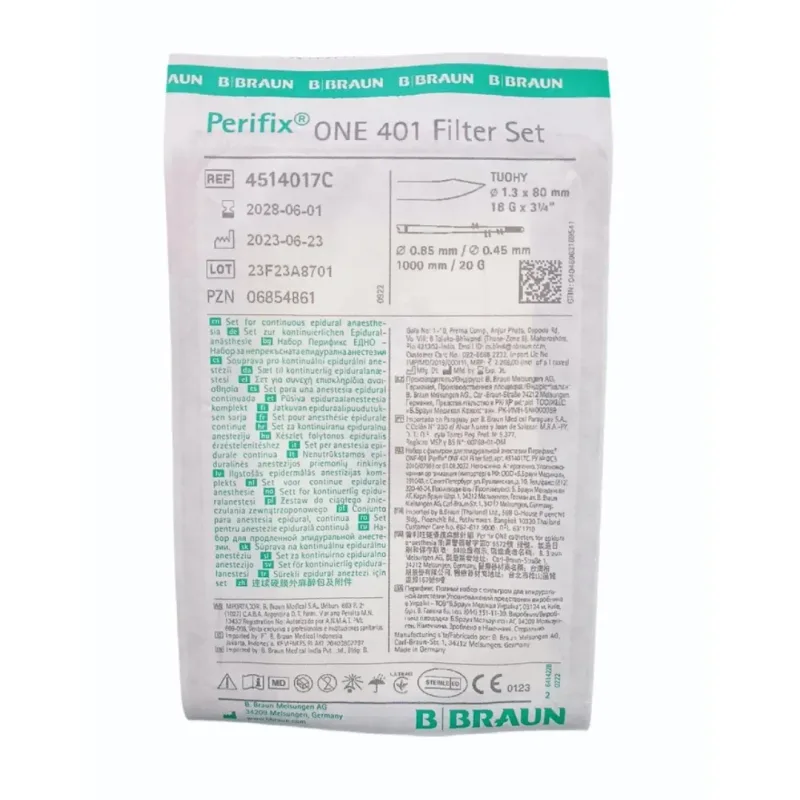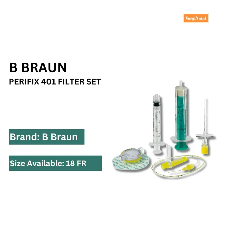 Key features of the Perifix One 401 Filter Set include its robust filter housing, which securely contains the filter membrane and facilitates fluid flow. The set is equipped with connection ports designed for secure and leak-free attachment to medical tubing and devices, often utilizing standard luer-lock connectors for broad compatibility. The inclusion of a transparent hub with wings allows for stable placement and manipulation during setup.
