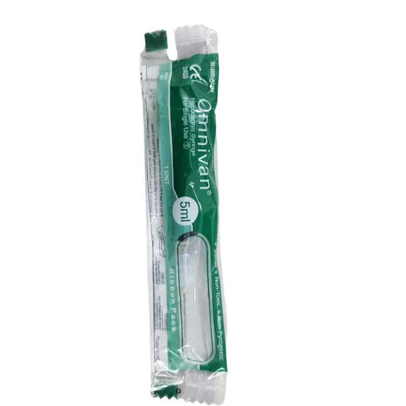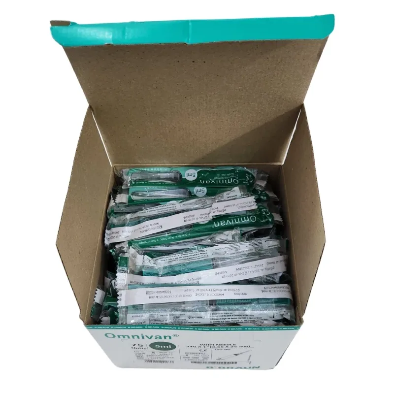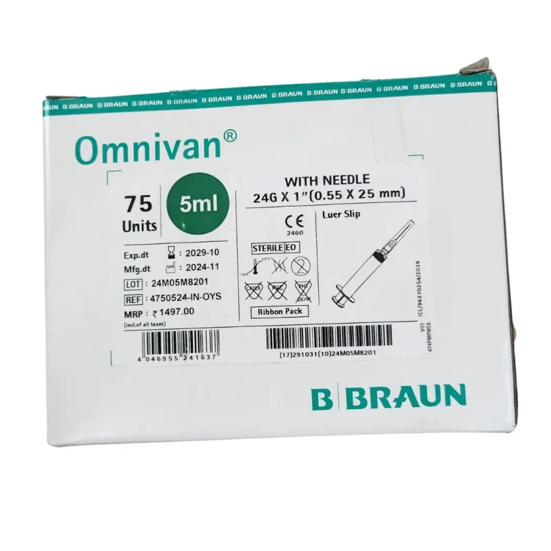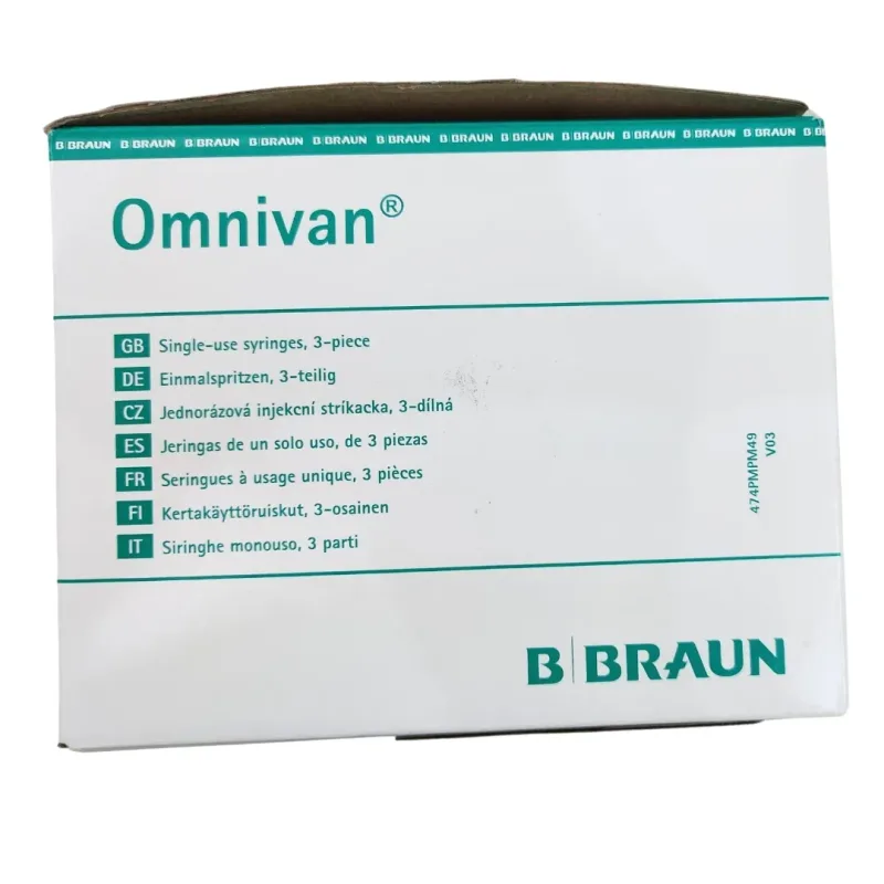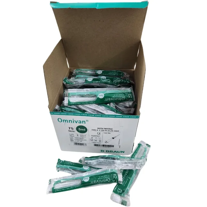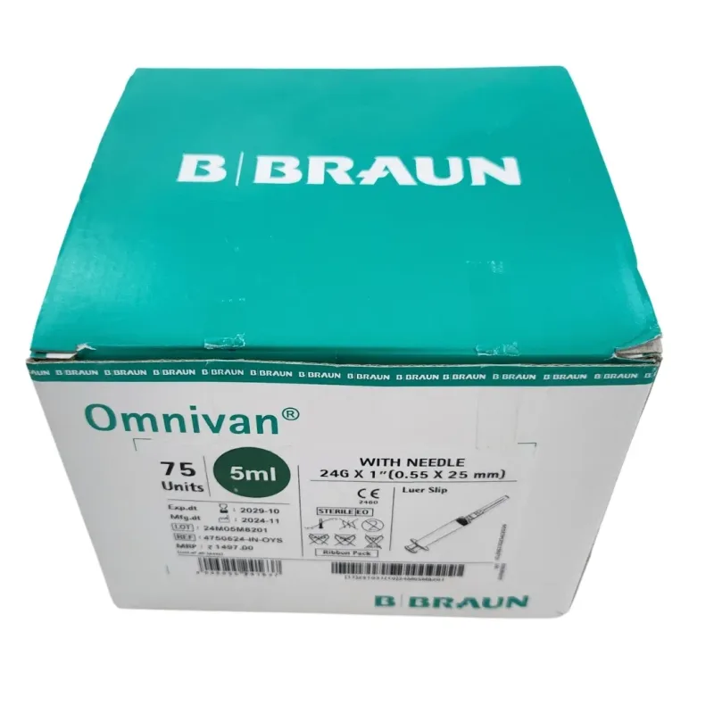 The B Braun Omnivan 5ml Syringe With Needle is a disposable medical device designed for the accurate aspiration and injection of fluids. This syringe features a transparent barrel constructed from medical-grade polypropylene, allowing for clear visualization of the contents and easy detection of air bubbles. The plunger is equipped with a thermoplastic elastomer (TPE) gasket, which is FDA-approved for medical use and ensures a smooth, consistent movement for precise fluid delivery.