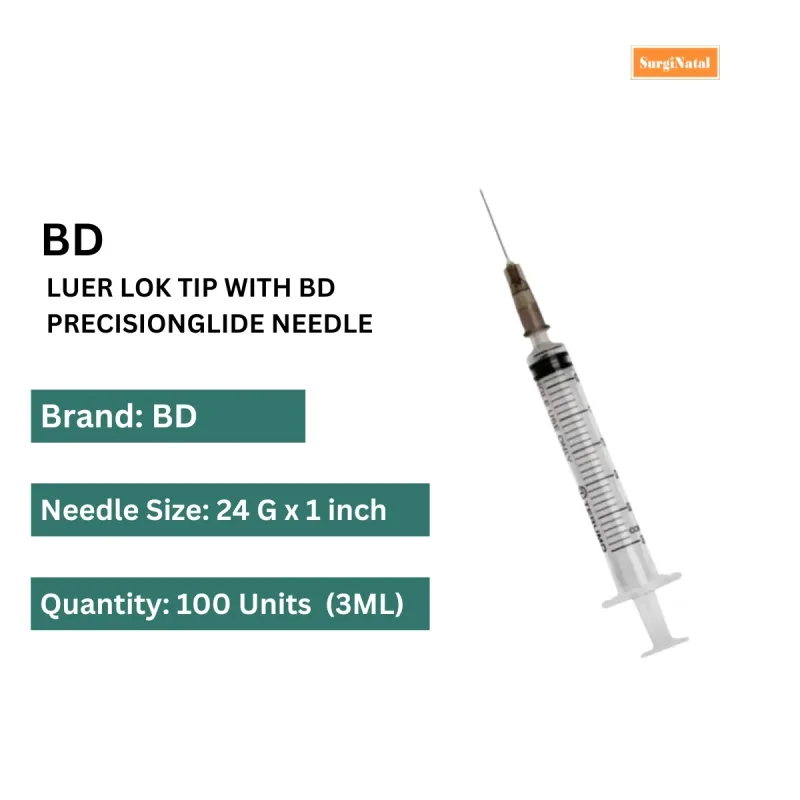 Each unit comes pre-attached with a BD PrecisionGlide needle. This needle is manufactured from stainless steel and features a 24-gauge (24G) bore, which is considered a fine gauge needle. The design of the PrecisionGlide needle aims to provide sharpness and a smooth glide through tissue, intended to minimize patient discomfort during injection or aspiration procedures.