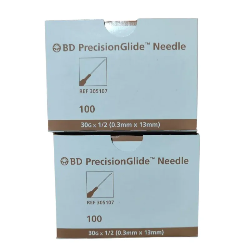 This specific configuration is a 30-gauge needle with a length of 1/2 inch (approximately 13mm). The package contains 100 individual units.