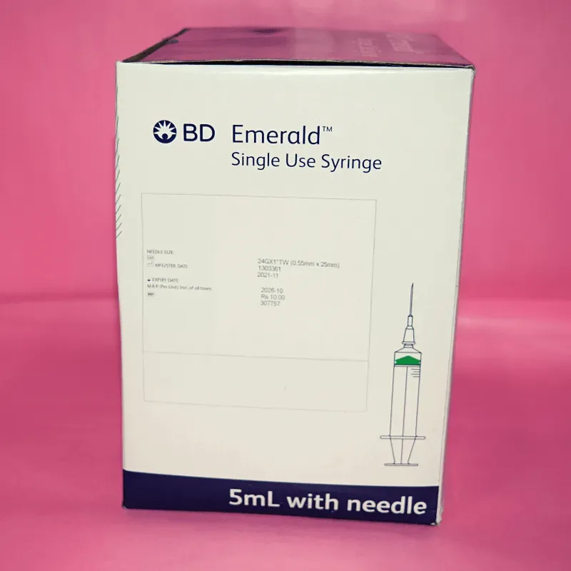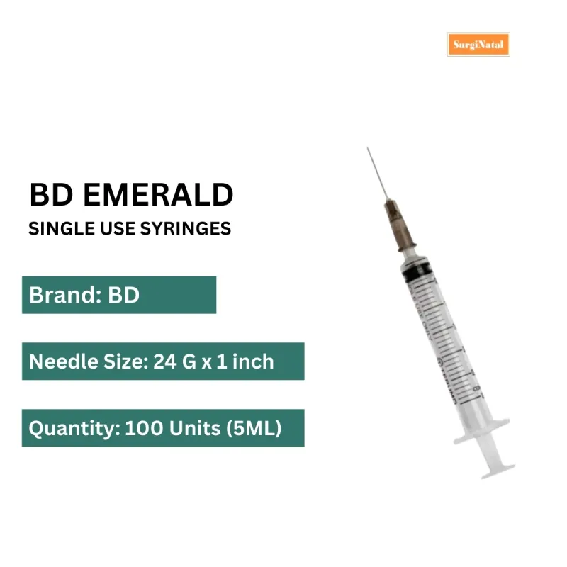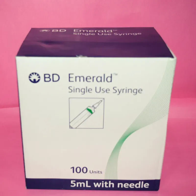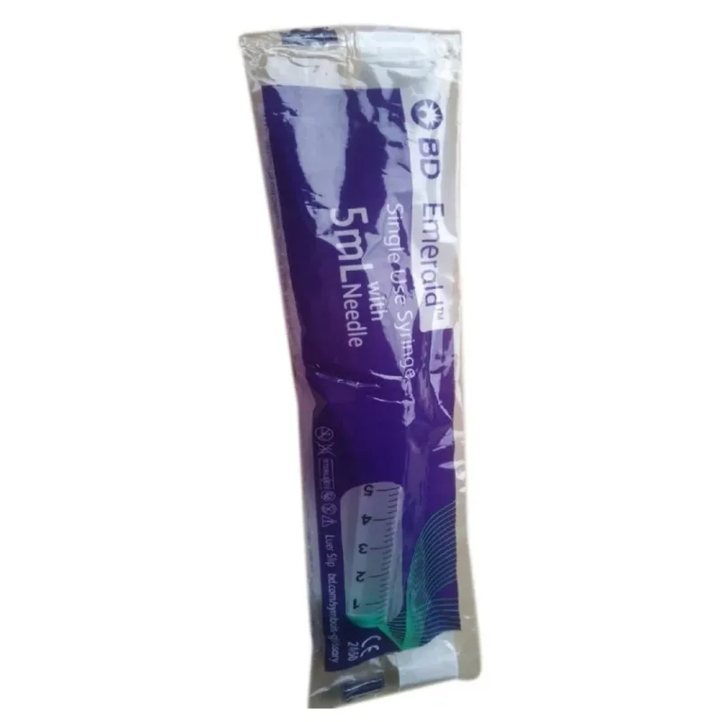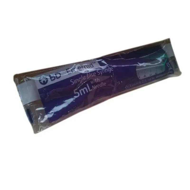 The BD Emerald 5ml Syringe with Needle is a disposable medical device designed for the accurate aspiration and injection of fluids. It consists of a graduated syringe barrel with a plunger and an attached needle. The syringe barrel is constructed from a non-toxic, drug-compatible material, ensuring compatibility with various medications.