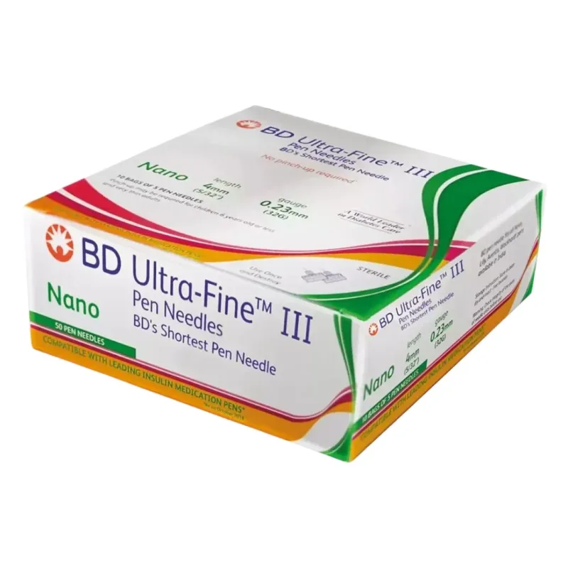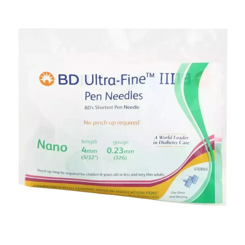 Key features include a 4mm (5/32 inch) needle length and a 0.23mm (32 gauge) needle size, which are among the smallest available for insulin pen delivery. The needles are constructed from non-toxic, non-pyrogenic stainless steel.