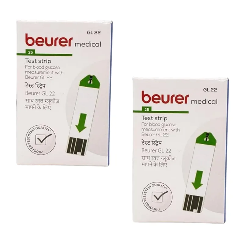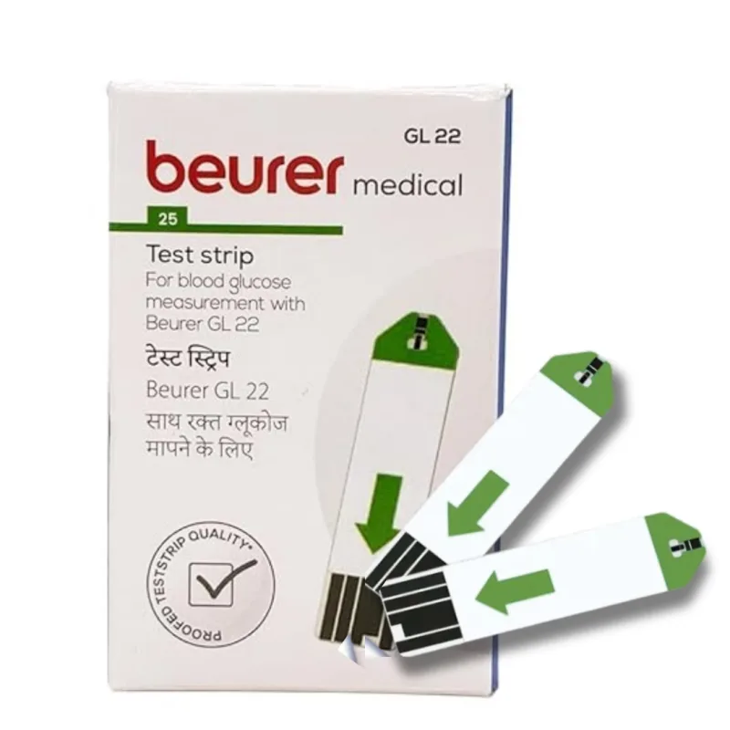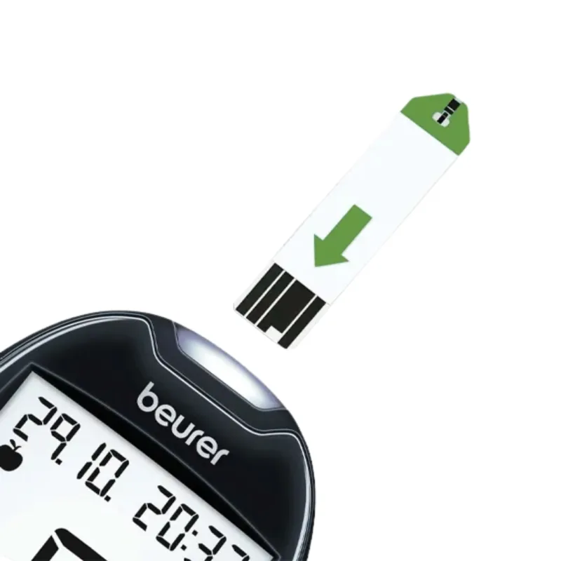This product consists of 25 disposable test strips designed for the quantitative measurement of glucose in fresh capillary whole blood. These strips are intended for use with compatible Beurer blood glucose monitoring systems. The strips employ advanced electrochemical biosensor technology, which converts the glucose in the blood sample into an electrical signal.
