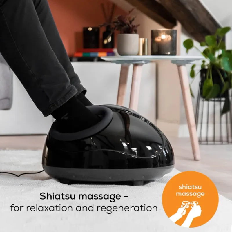 The Beurer FM-90 is a digital foot massager designed to provide therapeutic massage to the feet. It utilizes a combination of Shiatsu and air pressure techniques to target the soles and heels, aiming to alleviate discomfort and promote relaxation. The device incorporates a heating function that can be activated independently of the massage programs, offering an additional layer of comfort.