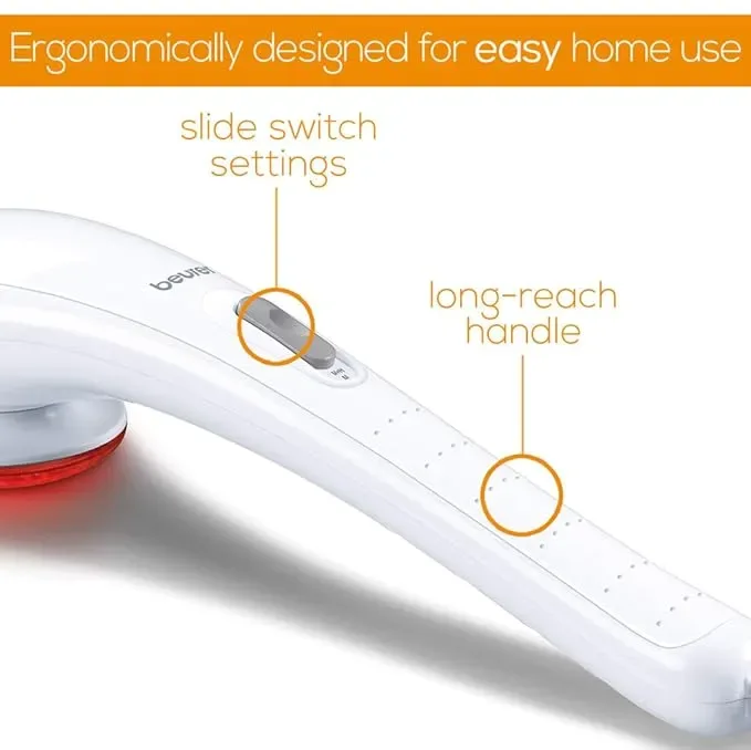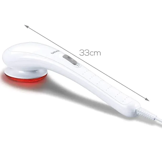 The Beurer MG 21 Infrared Massager is a personal care device designed to deliver a vibration massage with the option of infrared heat. This unit operates by generating oscillating movements to provide a tactile massage experience. The integrated infrared lamp emits heat, which can be activated independently or in conjunction with the vibration function, to potentially enhance muscle relaxation and comfort during use.