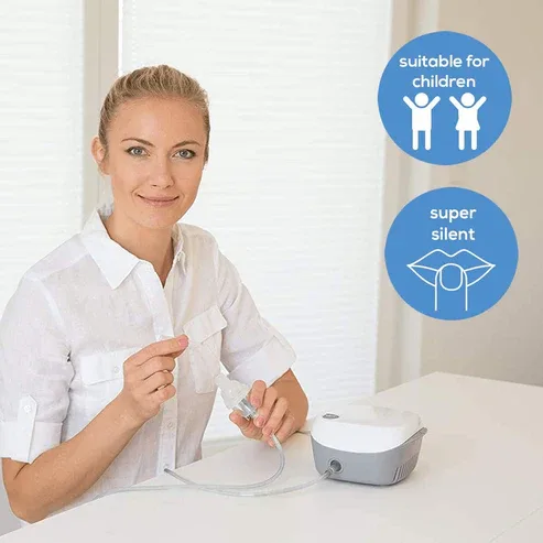Its construction utilizes medical-grade plastic and silicone components, ensuring durability and compatibility with medical applications. The unit is designed for home use and can be utilized by both adults and children, facilitating consistent respiratory care. The nebulizer operates on standard electrical power, with a wattage of 125 Watts and a voltage requirement of 230 Volts.