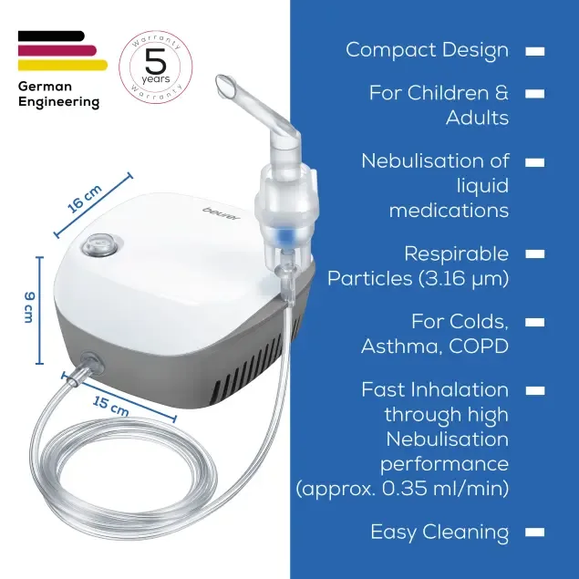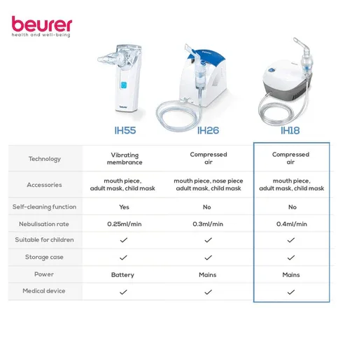 The Beurer Nebulizer IH18 is a medical device designed for delivering inhaled medications. It is engineered to produce a fine mist of medication, allowing for efficient delivery to the respiratory tract. The device is suitable for individuals requiring inhalation therapy for various respiratory conditions.