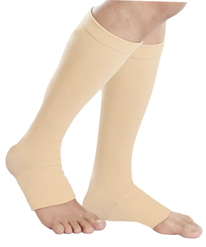 This product consists of a pair of below-knee compression stockings designed to provide graduated compression to the lower legs. The stockings are constructed from a blend of nylon and spandex, offering both durability and elasticity. They are engineered to apply pressure that is firmest at the ankle and gradually decreases as it moves up the leg.