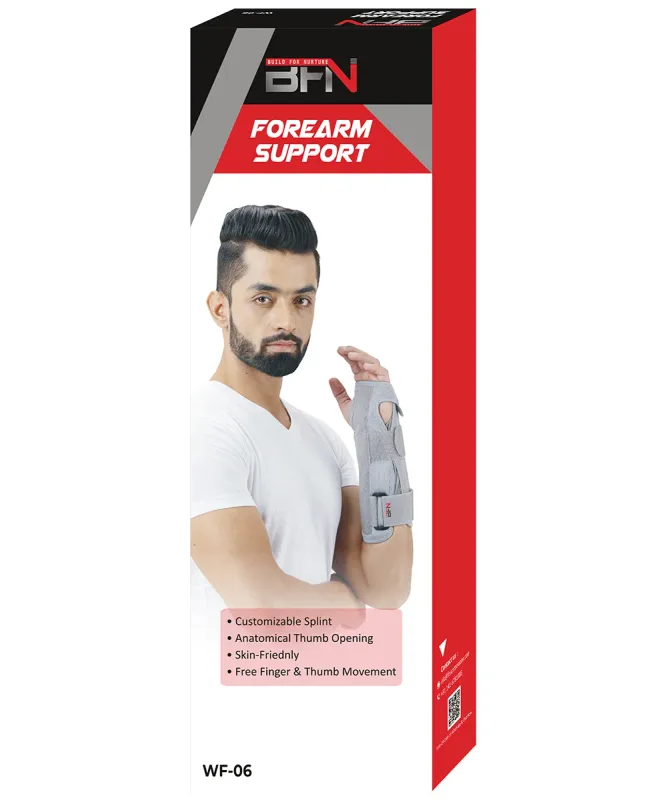 The BFN Forearm Splint is an orthopaedic device designed to provide support and immobilization to the forearm and wrist. It is constructed with a malleable aluminum stay that can be contoured to the user's anatomy, offering a customized fit. The splint is covered with a breathable, padded material to enhance comfort during prolonged wear.