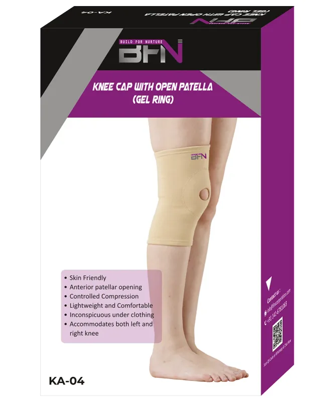 The BFN Knee Cap with Open Patella (Gel Ring) is an orthopaedic support designed to provide compression and stabilization to the knee joint. This brace is constructed from a breathable elasticated fabric that conforms to the natural shape of the leg, offering a comfortable and secure fit. The key distinguishing feature is the integrated open patella design, which incorporates a gel ring.