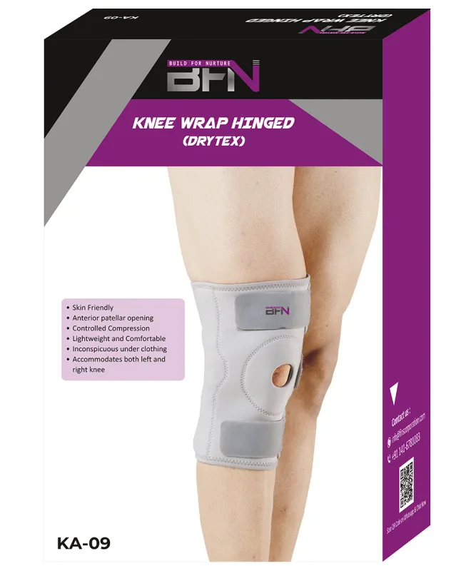 The BFN Knee Wrap Hinged (Drytex) is an orthopaedic brace designed to provide support and stability to the knee joint. Constructed from Drytex material, it offers a breathable and comfortable fit for extended wear. The brace features a hinged design that allows for controlled range of motion, aiding in the recovery and management of various knee conditions.