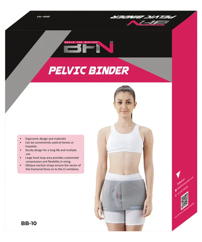 The BFN Palvic Binder is a medical device designed to provide external support and compression to the pelvic region. It is constructed from durable, breathable materials that ensure comfort during prolonged wear. The binder features an ergonomic design intended to conform to the natural contours of the body, facilitating its use in various settings, including both clinical environments and home care.