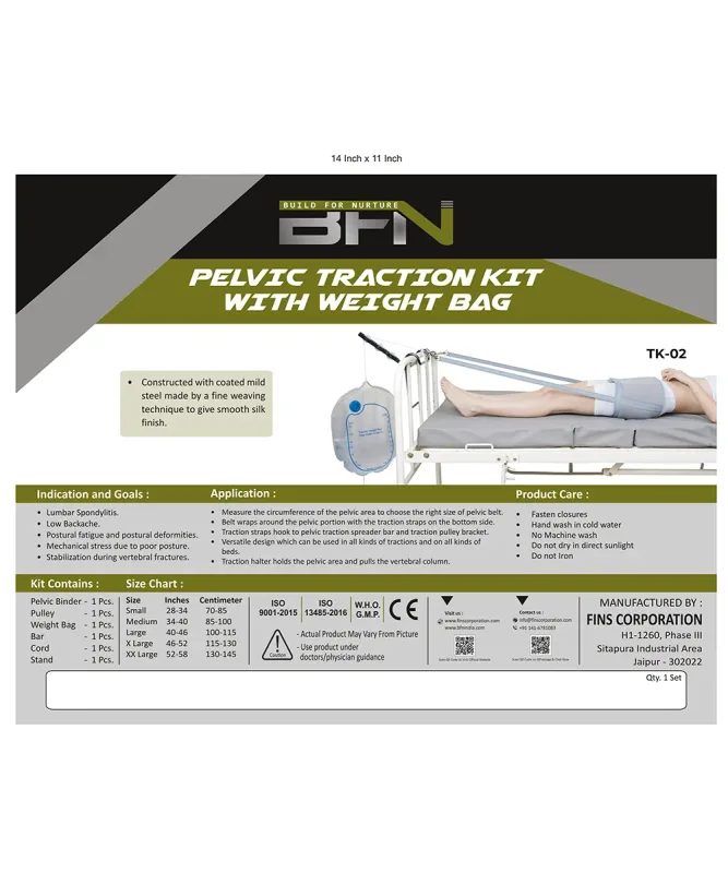 The key features of this kit include its robust construction from coated mild steel, manufactured with a fine weaving technique for a smooth finish, ensuring durability and patient comfort. The pelvic belt is designed for adjustability, allowing for a secure and customized fit. The kit's versatility is a significant benefit, as it can be adapted for use with various types of traction and is compatible with different bed configurations, making it suitable for diverse clinical settings.