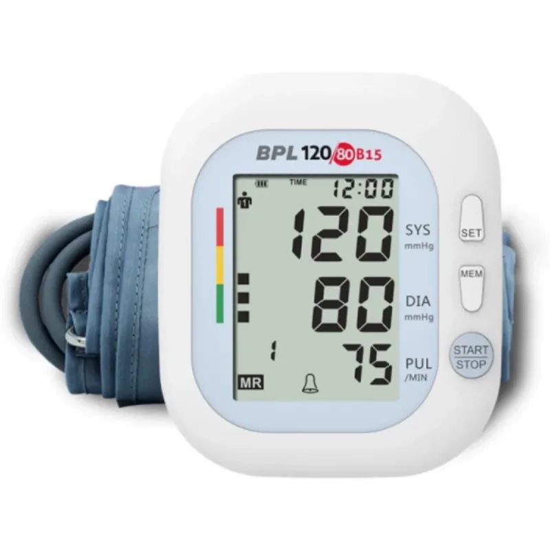 The BPL 120/80 B15 is a digital blood pressure monitor designed for the non-invasive measurement of systolic and diastolic blood pressure, as well as pulse rate. This device utilizes an oscillometric method to detect blood pressure fluctuations. It features a universal cuff, measuring 22 by 32 centimeters, which is designed to encircle the upper arm and temporarily restrict blood flow to facilitate accurate readings.