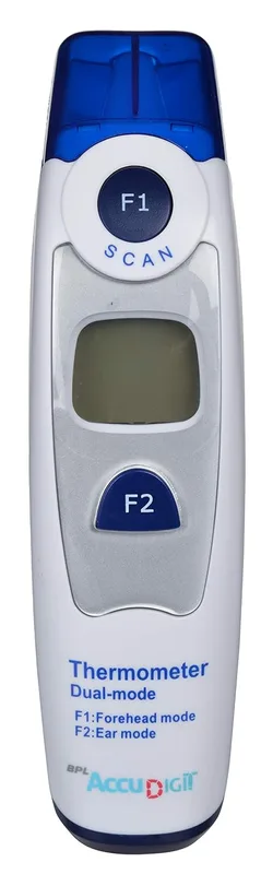 The BPL Accudigit Dual is a digital infrared thermometer designed for non-contact temperature measurement. This device offers the flexibility to obtain readings from either the forehead or the ear canal, catering to different user preferences and clinical situations. Its dual-mode functionality allows for temperature display in both Fahrenheit (°F) and Celsius (°C) scales, ensuring compatibility with various measurement standards and user familiarity.