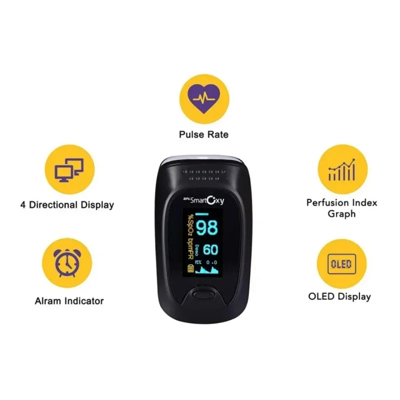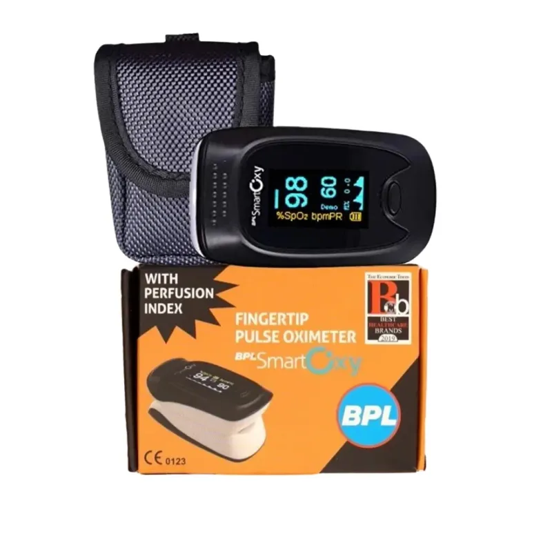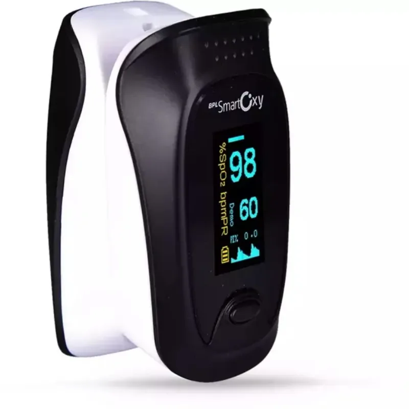 The BPL Smart Oxy Pulse Oximeter is a digital medical instrument designed for non-invasive measurement of blood oxygen saturation (SpO2), pulse rate (PR), and Perfusion Index (PI). This device is intended for use on a fingertip to provide real-time physiological data. The instrument operates by utilizing two wavelengths of light to measure the amount of oxygenated hemoglobin in the blood.