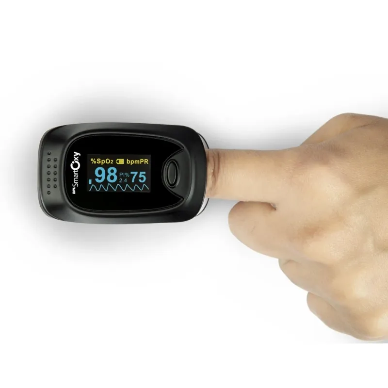 The device features a clear color OLED display that presents readings in a variety of formats, with six selectable display modes and four directional viewing options to facilitate readability from different perspectives. Its compact and lightweight design makes it suitable for a range of finger sizes and promotes portability for use in various settings. The power source for the device is two AAA alkaline batteries, and it incorporates a low battery indicator to signal when replacement is needed.