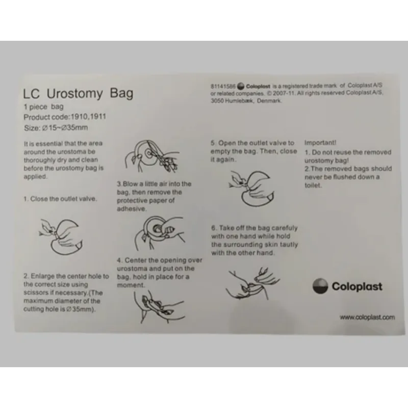 The Coloplast Urostomy Bag 1910 is a single-piece ostomy appliance designed for individuals who have undergone a urostomy procedure. This product is intended to collect urine from the stoma, providing a secure and discreet containment solution. The appliance is constructed with materials chosen for their compatibility with skin and their ability to withstand the demands of daily use.