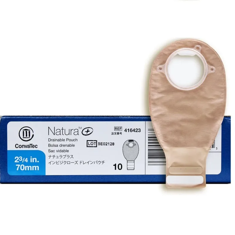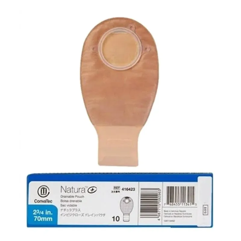 The ConvaTec 416423 Natura Drainable Pouch is a component of a two-piece ostomy system designed for individuals requiring ostomy care. This particular pouch is a drainable type, meaning it can be emptied and reused. It is constructed with soft, quiet materials that are resistant to water and dry quickly, contributing to user comfort and discretion.