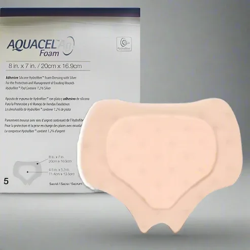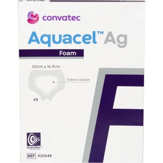 The ConvaTec Aquacel Ag Adhesive Foam dressing is a sterile, advanced wound care product designed for the management of exuding wounds. It is a multi-layered dressing that combines the benefits of hydrofiber technology with the antimicrobial properties of ionic silver. The dressing is designed to create a moist wound healing environment, which is conducive to the body's natural healing processes.