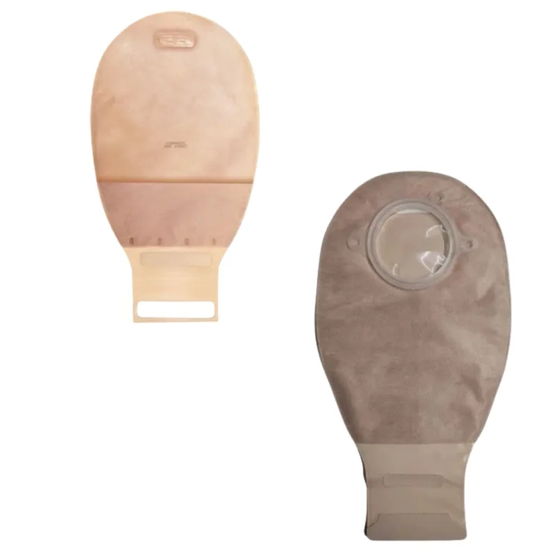 It is designed to be opaque, offering discretion. The system incorporates an integrated filter to manage effluent odor and gas, and utilizes a Lock-it Pocket™ system for secure closure of the drainable tail. The pouch is intended to be attached to a separate skin barrier component of a two-piece ostomy system, allowing for pouch changes without disturbing the skin barrier.