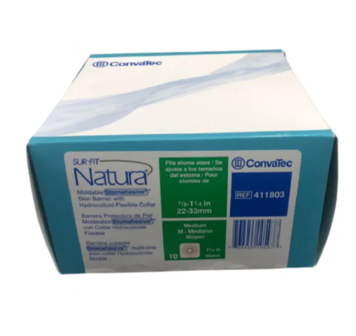 The ConvaTec 411803 Sur-Fit Natura Moldable Stomahesive Plate is a skin barrier designed for ostomy care. It functions as a protective interface between the stoma and the ostomy appliance, utilizing a moldable Stomahesive formulation. This material is engineered to conform to the contours of the skin around the stoma, creating a seal that helps prevent leakage of stoma output.