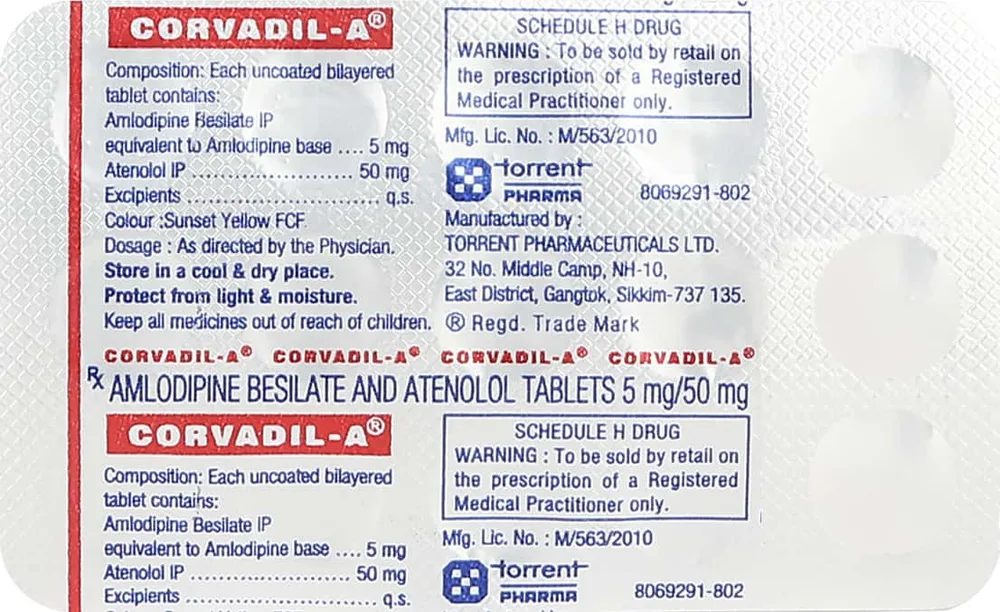 Corvadil A Tablet is an antihypertensive medicine used to treat high blood pressure and angina pectoris. Angina pectoris is a condition characterised by chest pain, tightness, and a squeezing sensation in the chest that radiates toward the shoulders, arms, and neck. It consists of a combination of two medicines, namely amlodipine and atenolol.