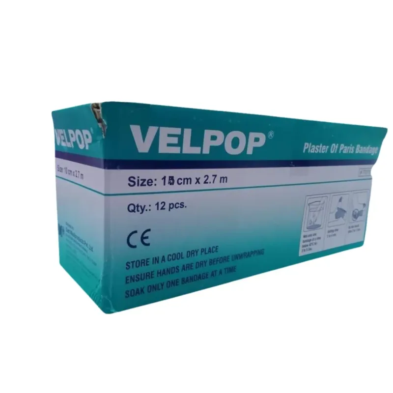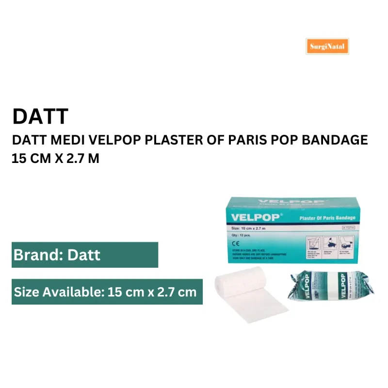 The Datt Medi Velpop Plaster of Paris Bandage is a medical dressing designed for orthopedic immobilization. It is constructed from a woven cloth substrate impregnated with Plaster of Paris. When activated by water, the Plaster of Paris undergoes a chemical reaction, causing the bandage to harden and form a rigid cast.