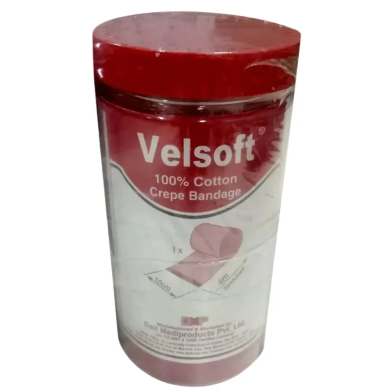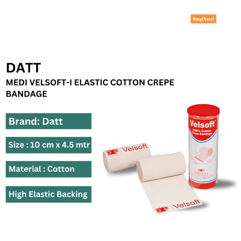 The Datt Medi Velsoft-I Elastic Cotton Crepe Bandage is a Type 3 light compression bandage designed to offer sustained, gentle pressure. Constructed from a blend of cotton and Lycra, this bandage provides a soft and comfortable feel against the skin. Its construction minimizes the risk of irritation, making it suitable for prolonged wear.