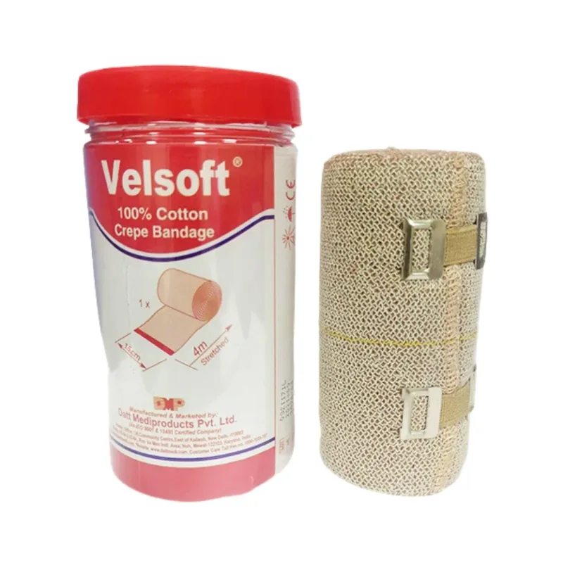 The Datt Medi Velsoft-I Elastic Cotton Crepe Bandage is a Type 3 light compression bandage designed to provide sustained, gentle pressure. Constructed from a blend of cotton and Lycra, this bandage offers a soft and comfortable feel against the skin, making it suitable for extended wear. The material composition allows for breathability while maintaining its elasticity to conform to body contours.