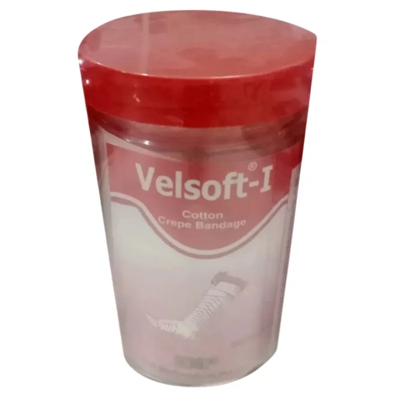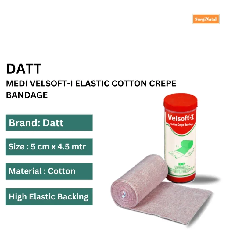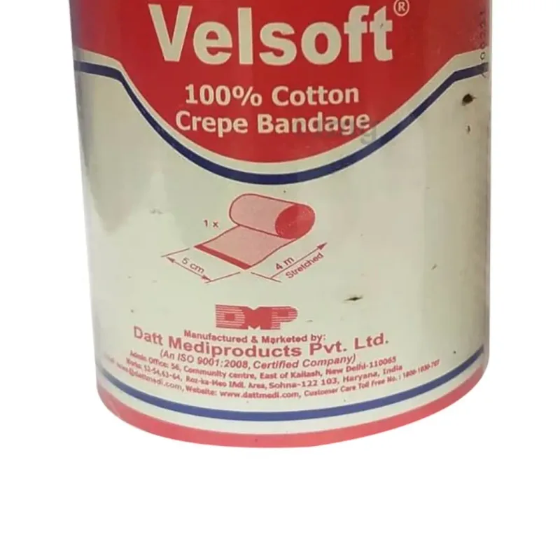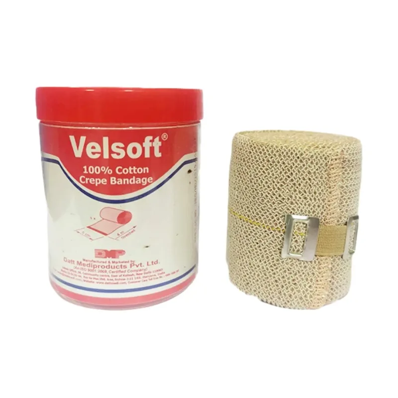 The Datt Medi Velsoft-I Elastic Cotton Crepe Bandage is a Type 3 light compression bandage designed to provide sustained, gentle pressure. Constructed from a blend of cotton and Lycra, this bandage offers a soft and comfortable feel against the skin, making it suitable for prolonged wear. Its construction aims to prevent slippage and maintain its position effectively.