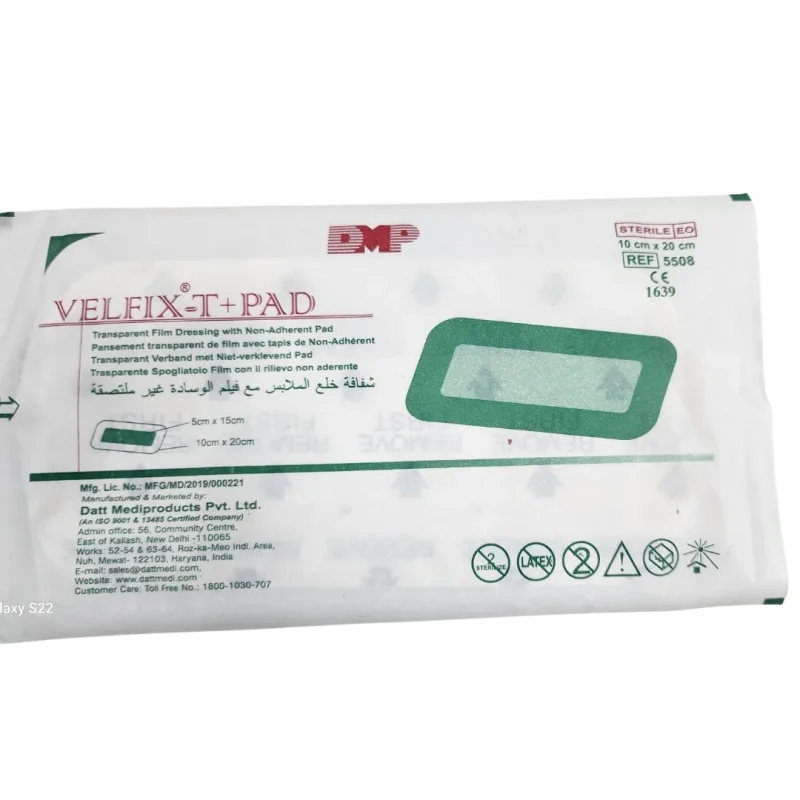 The Datt Velfix-T+Pad is a sterile, transparent film dressing designed for wound management. It integrates a non-adherent absorbent pad within a flexible polyurethane film backing. The dressing is constructed to provide a protective barrier over wounds, facilitating a conducive environment for healing.