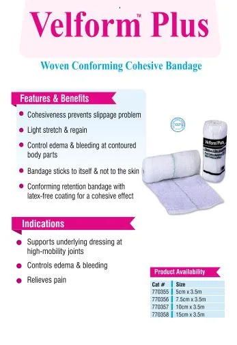 The Datt Velform Plus Woven Conforming Cohesive Bandage is a specialized medical dressing designed for secure and effective wound management and support. Constructed from 100% cotton, this bandage offers a lightweight feel with a subtle stretch capability, allowing it to adapt to various anatomical contours. Its unique cohesive properties are achieved through a latex-free coating, which enables the bandage to adhere to itself rather than to the patient's skin or hair.