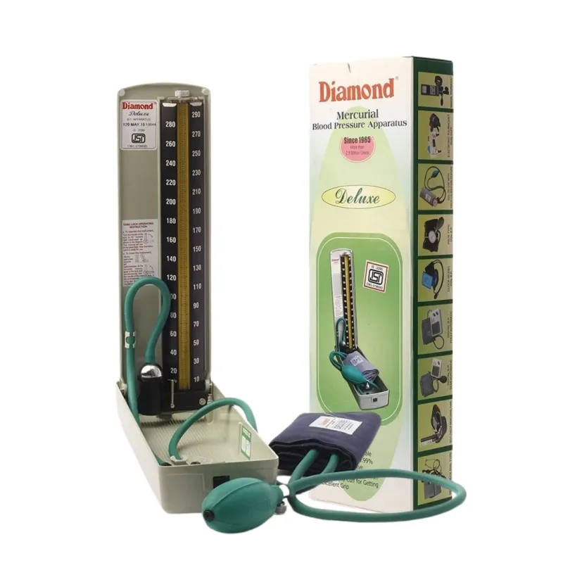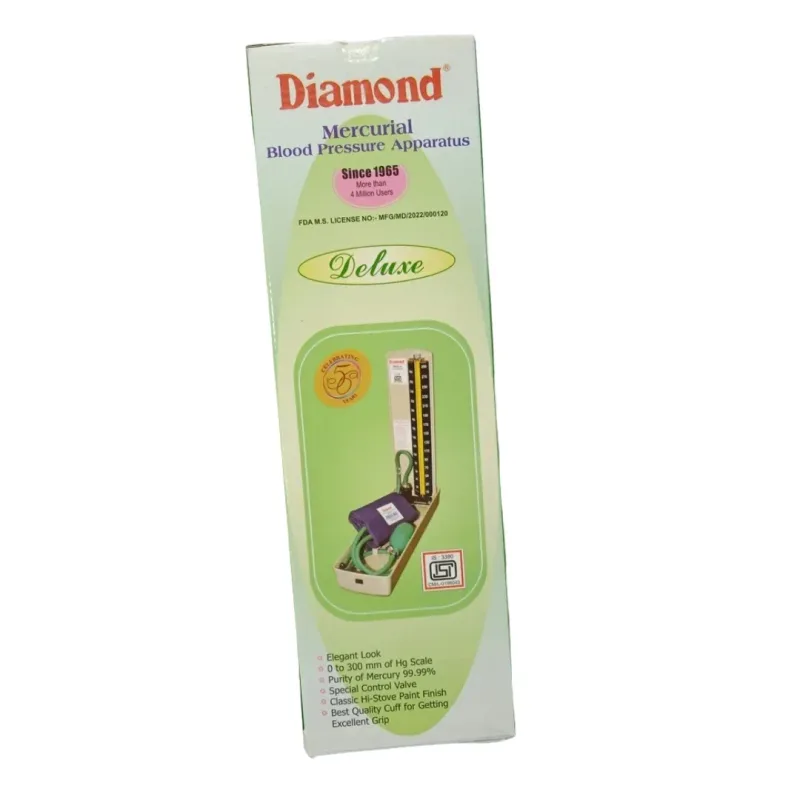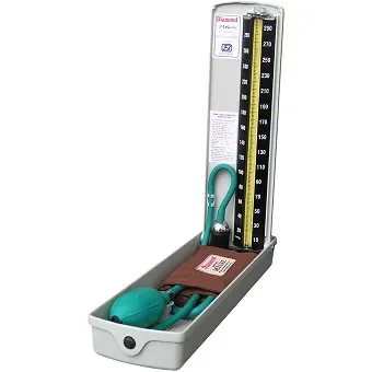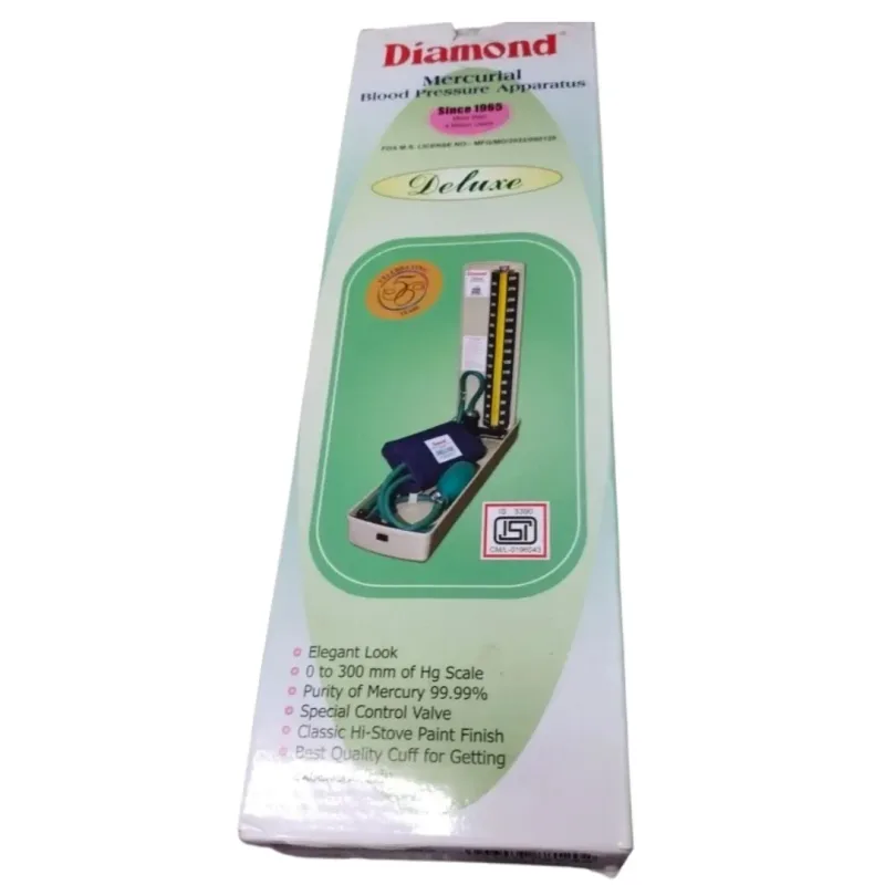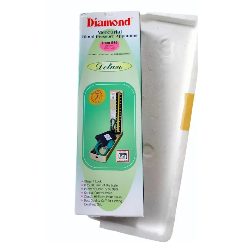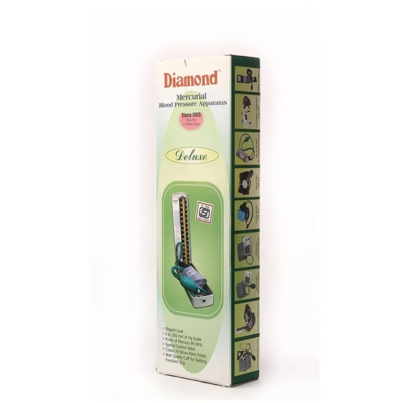 The Diamond Mercurial Blood Pressure Apparatus Deluxe-BPMR120 is a desktop sphygmomanometer designed for the auscultatory measurement of blood pressure. This instrument utilizes a mercury column for pressure indication, offering a display range from 10 to 300 mm Hg. The resolution of the mercury column is 2 mm Hg, and the device is calibrated for an accuracy of +/- 3 mm Hg for pressure readings.