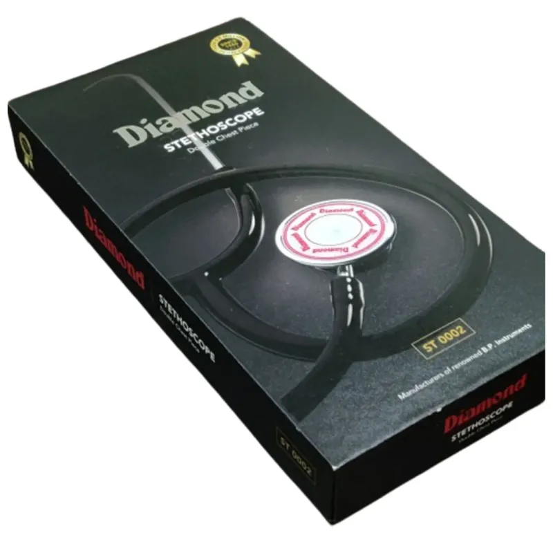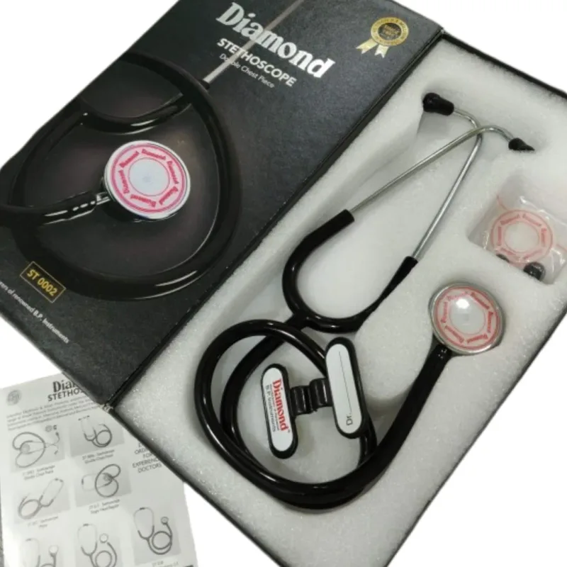 The key features of the Diamond Stethoscope (ST 0002) include its dual-head chest piece, providing versatility in listening to both high and low-frequency sounds. The use of medical-grade brass for the chest piece and chrome-plated brass for the binaural assembly contributes to its acoustic performance and longevity. The soft, adjustable ear tips are a significant benefit, enhancing user comfort during prolonged examinations, which is crucial for medical professionals who may use the instrument for extended durations.