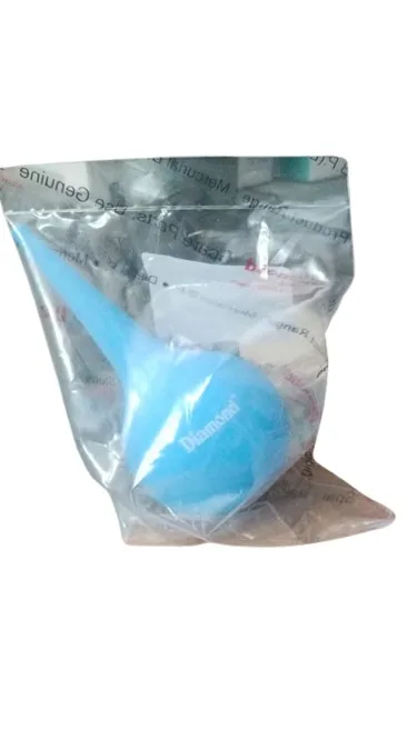The Diamond Suction Bulb SB001 is a medical device designed for the removal of mucus and other fluids from the respiratory tract. This 65ml capacity bulb syringe is constructed from medical-grade silicone, a material selected for its flexibility, durability, and biocompatibility. The blue coloration aids in visibility and identification within a clinical setting.