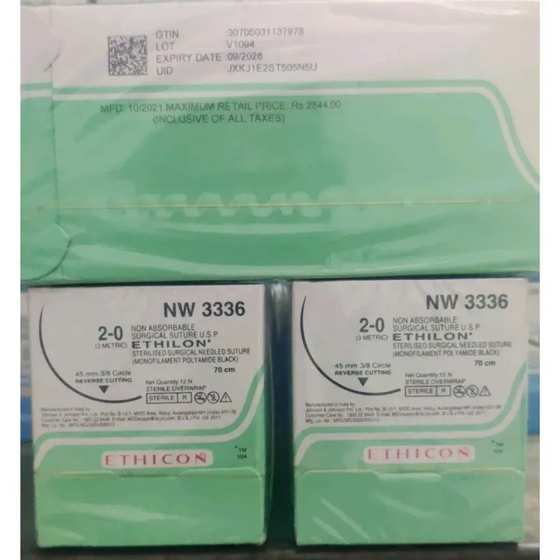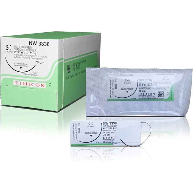 This product consists of Ethilon sutures, a type of non-absorbable surgical thread manufactured from monofilament polyamide. Designed for use in a variety of surgical procedures, these sutures are engineered to provide reliable wound closure and support. The material is selected for its smooth surface, which facilitates passage through tissue with reduced drag, and its inherent strength.