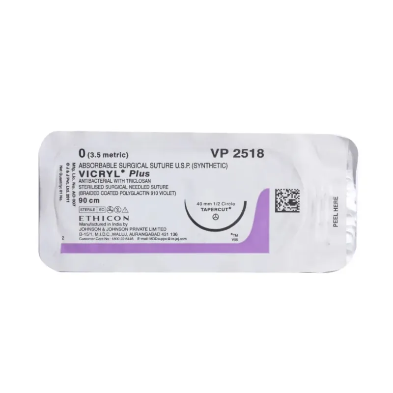 Ethicon Vicryl Plus (Polyglactin 910) Suture USP 0 is a braided absorbable suture used for vaginal cuff closure and other soft tissue approximation procedures. This suture offers excellent handling, strength, and secure knotting properties.
