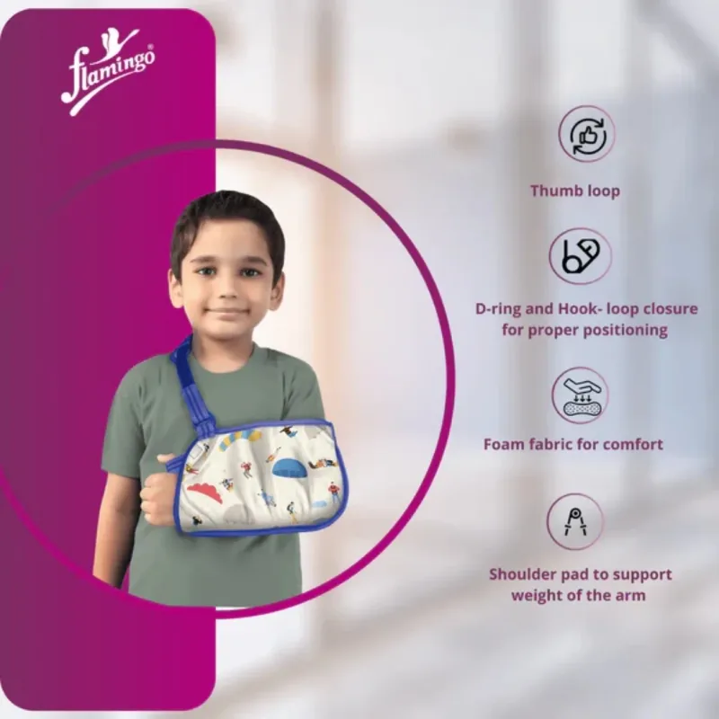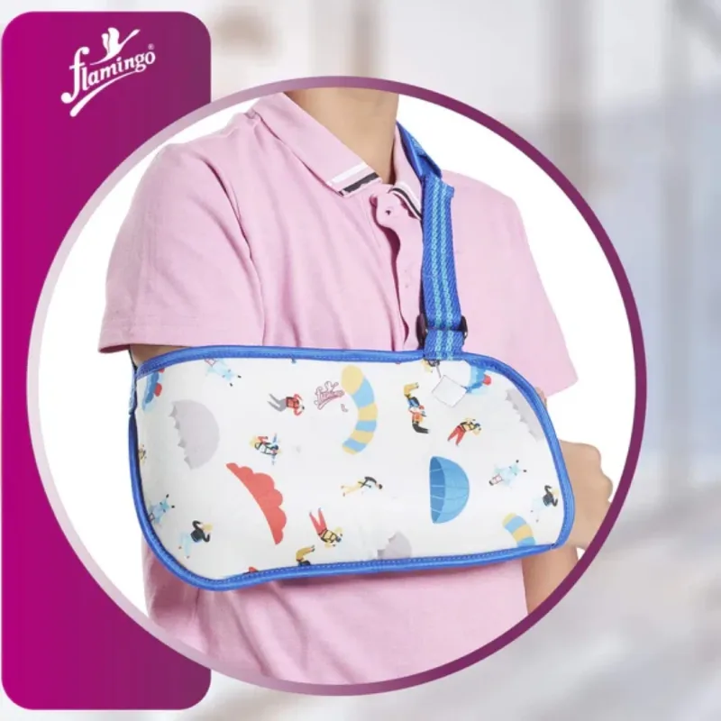 Flamingo Pediatric Arm Sling is designed for children to give them firm support while recovering from arm injuries such as fractures and dislocations. Its unique design ensures superb immobilisation of the elbow and provides comfort to the kids.
