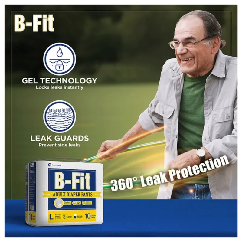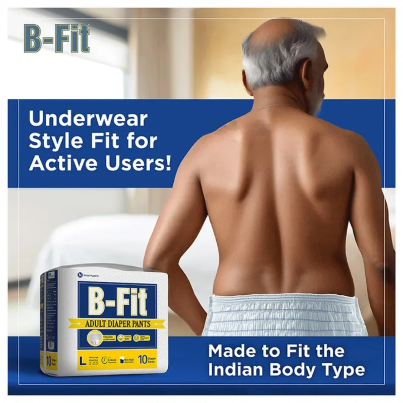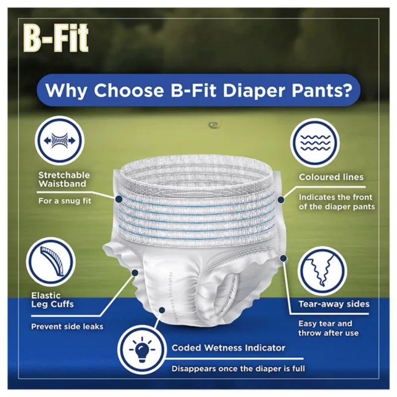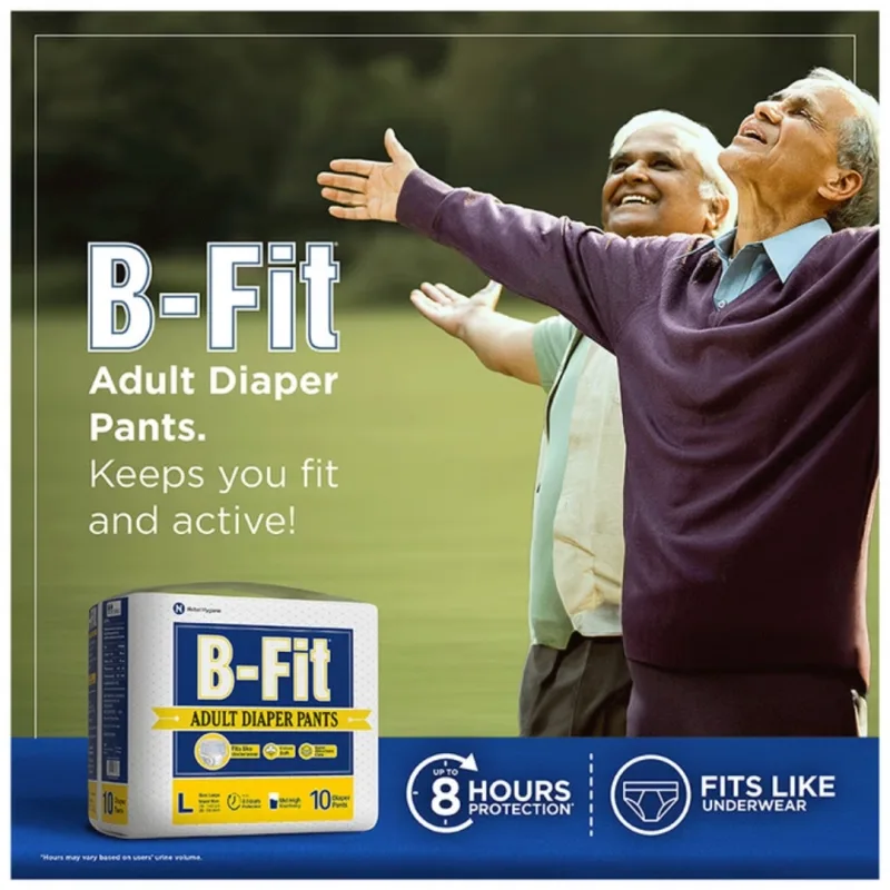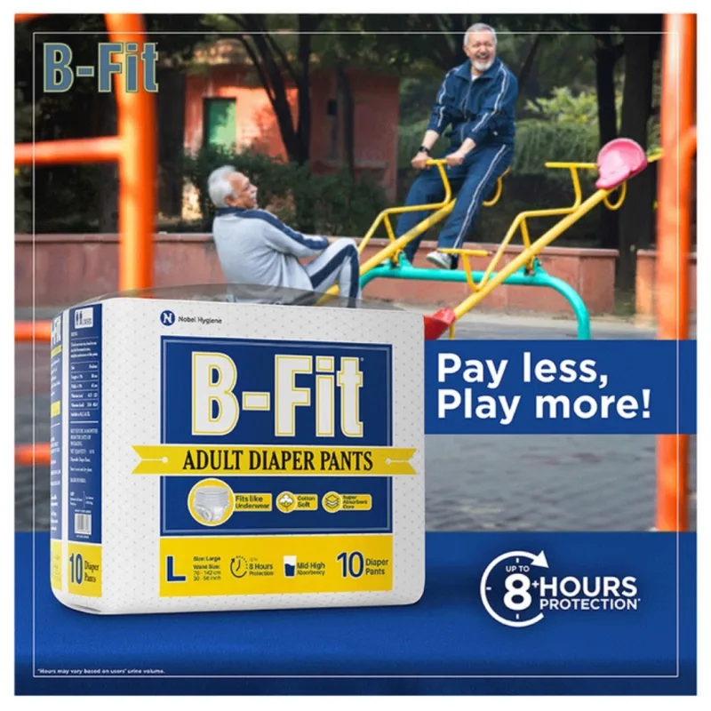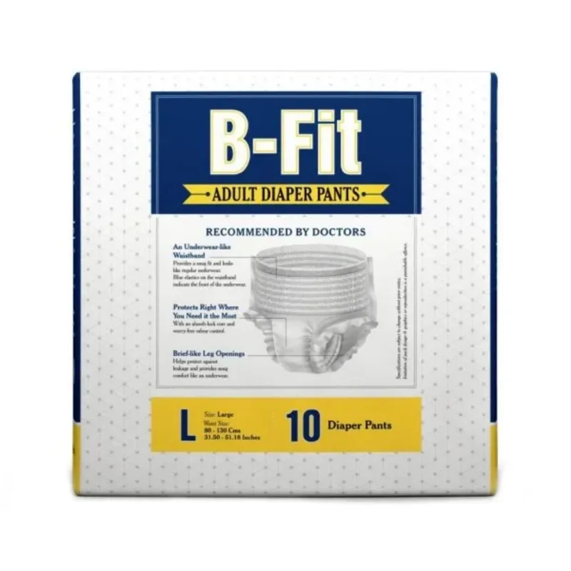 B-Fit Adult Diaper Pants is an underwear-like waistband with an absorb lock, best for moderate to heavy incontinence protection. Looks like regular underwear and provides a snug fit, and prevents urine leakage from all sides and gives protection for 10 hours. Deals with poor bladder and bowel control and can be used by adults with active life and adults with mobility impairment, dementia, severe diarrhea or injuries and accidents.