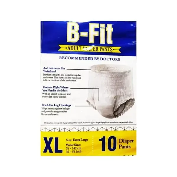 B-Fit Adult Diaper Pants is an underwear-like waistband with an absorb lock, best for moderate to heavy incontinence protection. Looks like regular underwear and provides a snug fit, and prevents urine leakage from all sides and gives protection for 10 hours. Deals with poor bladder and bowel control and can be used by adults with active life and adults with mobility impairment, dementia, severe diarrhea or injuries and accidents.