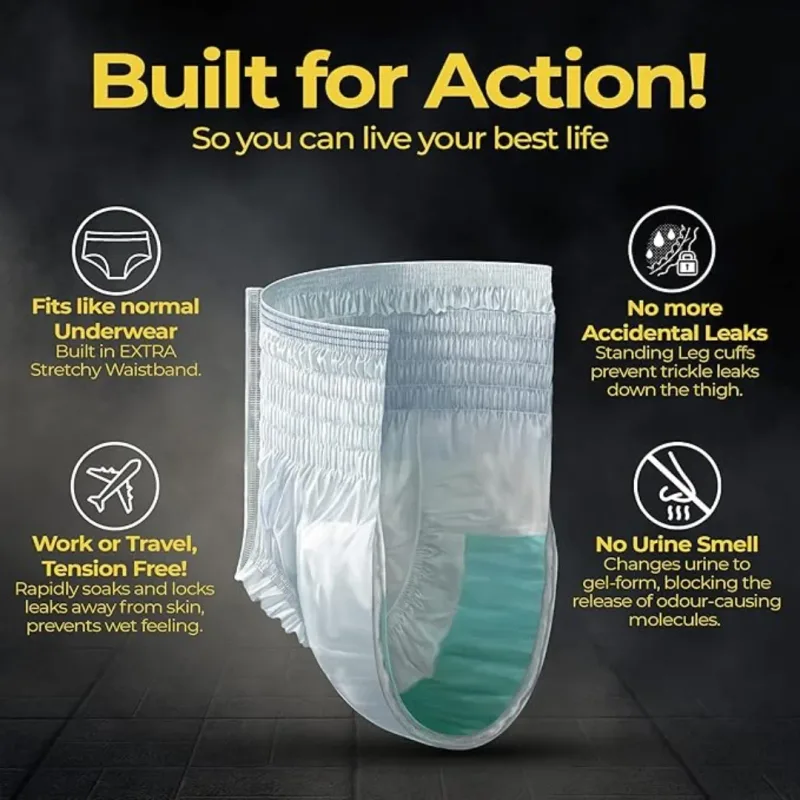These dry pants’ raised side-leak lock system should fit snugly into the space between thighs while the soft-elastic waistband is comfortably placed.